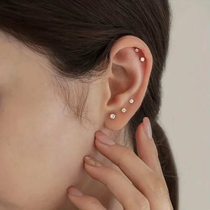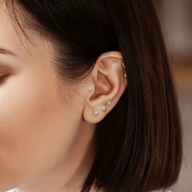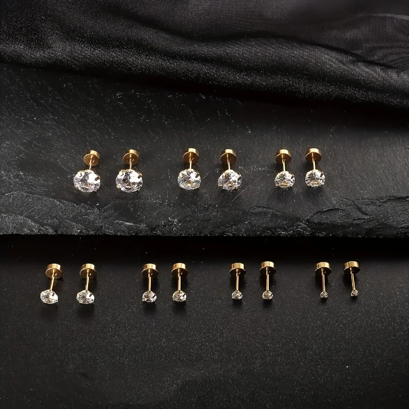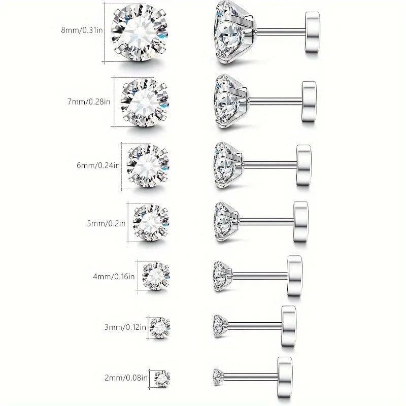 7pcs/Set Stainless Steel Crystal Flat Studs Women Men Bar Screw Back Tragus Round Clear Cubic Zirconia Piercing Earrings Jewelry